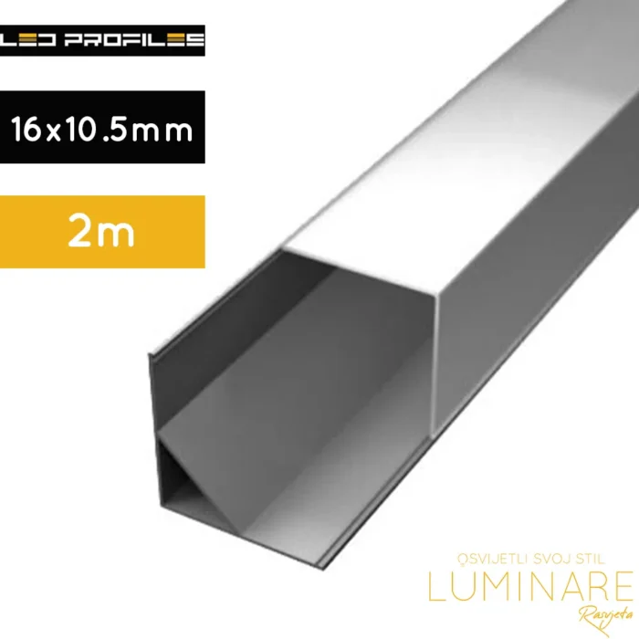 Aluminijski profil za LED traku dolazi u paketu sa nosačima kojima ga se učvrsti za ravnu površinu, bočnim čepovima i mliječnim difuzorom. Dužina je 2m, a visina 16 mm.