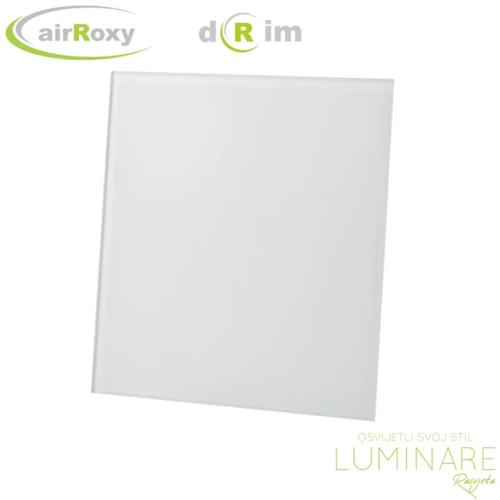 Izrađen od stakla i dolazi u dimenziji 175 × 175 mm, što ga čini univerzalno kompatibilnim s airRoxy dRim ventilatorima promjera 100 mm i 125 mm, kao i s dRim dekorativnim rešetkama namijenjenima za prekrivanje ventilacijskih i ispušnih otvora. Bijelo sjajna boja posebno je pogodna za moderne kupaonice, WC-e, hodnike, kuhinje te hotelske i apartmanske prostore gdje se traži minimalistički i uredan izgled.