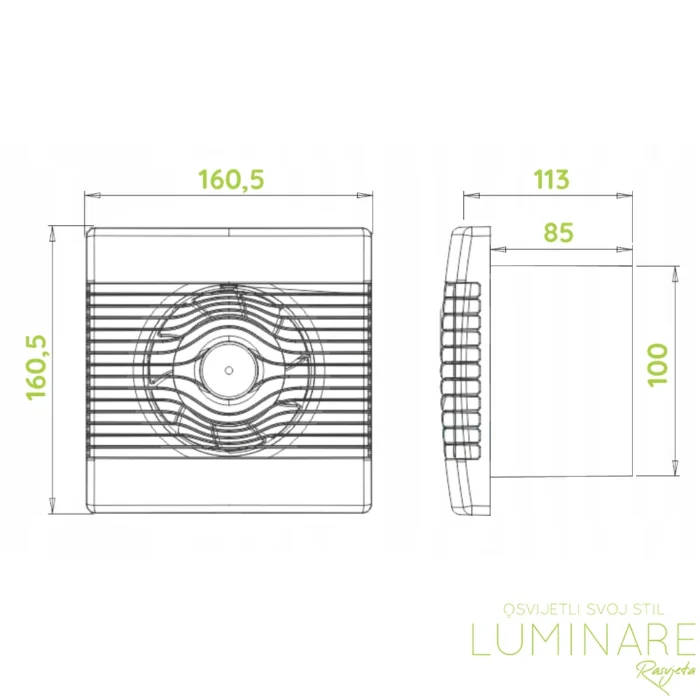 Posebno oblikovane lopatice turbine omogućuju učinkovit protok zraka od 104 m³/h uz smanjenu razinu buke i ekonomičnu potrošnju energije. Snaga od 15W pruža optimalan omjer performansi i učinkovitosti, čime se osigurava pouzdano uklanjanje vlage, pare i neugodnih mirisa.