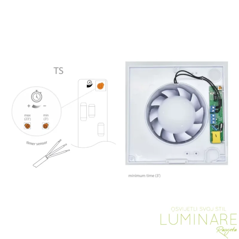 Model je opremljen timer senzorom (TS) koji omogućuje odgođeno isključivanje nakon gašenja svjetla. Time se osigurava dodatno provjetravanje prostora i smanjuje rizik od kondenzacije i nastanka plijesni. Zbog integrirane elektronike potreban je trožilni kabel za stalno napajanje i upravljački vod.