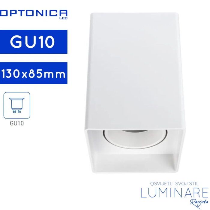 Kvadratna stropna svjetiljka bijele boje predviđena za žarulju GU10, nezakretna.