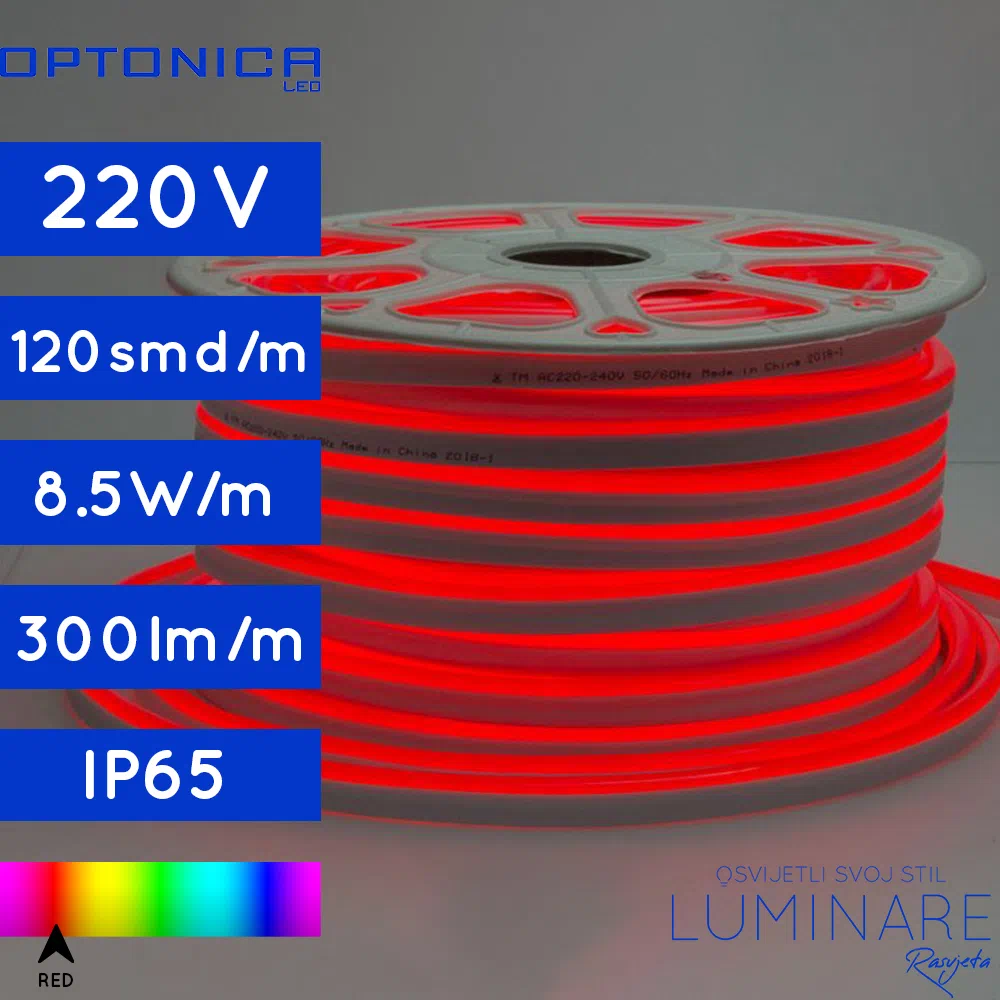 LED Flex Neon sa 120 čipova po metru i stupnjem zaštite IP65. Za rad Flex neona potrebno je kupiti i priključni kabel.