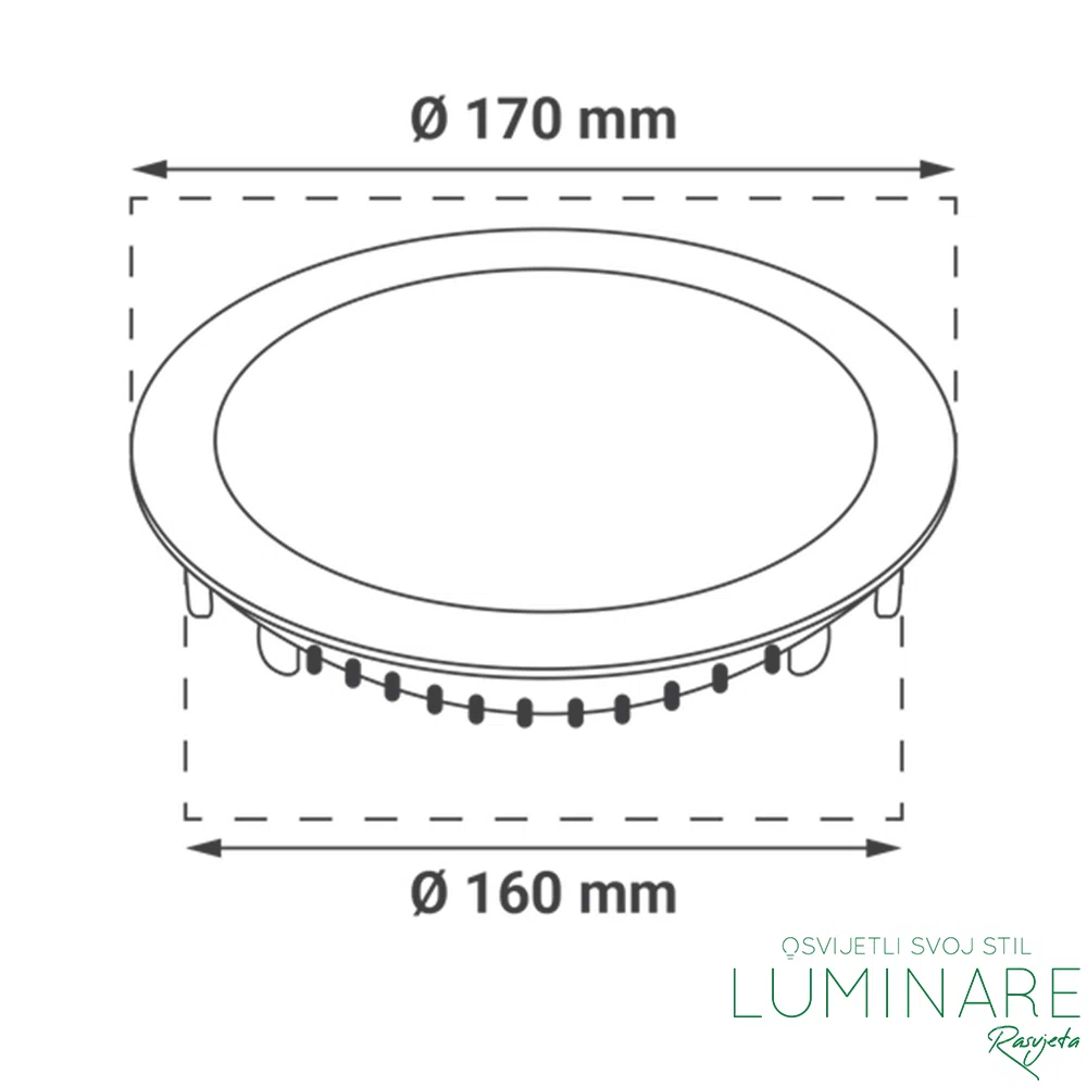 Promjera 170 mm, izrađen od visokokvalitetnih materijala, ovaj LED panel osigurava dug vijek trajanja i visoku energetsku učinkovitost. Blago uvučen difuzor doprinosi elegantnom izgledu rasvjete i omogućuje ravnomjernu distribuciju svjetla, što ga čini ugodnim za oči i idealnim za dugotrajnu upotrebu.