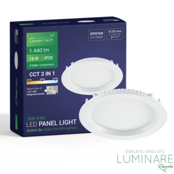 Promjera 220 mm, izrađen od visokokvalitetnih materijala, ovaj LED panel osigurava dug vijek trajanja i visoku energetsku učinkovitost. Blago uvučen difuzor doprinosi elegantnom izgledu rasvjete i omogućuje ravnomjernu distribuciju svjetla, što ga čini ugodnim za oči i idealnim za dugotrajnu upotrebu.