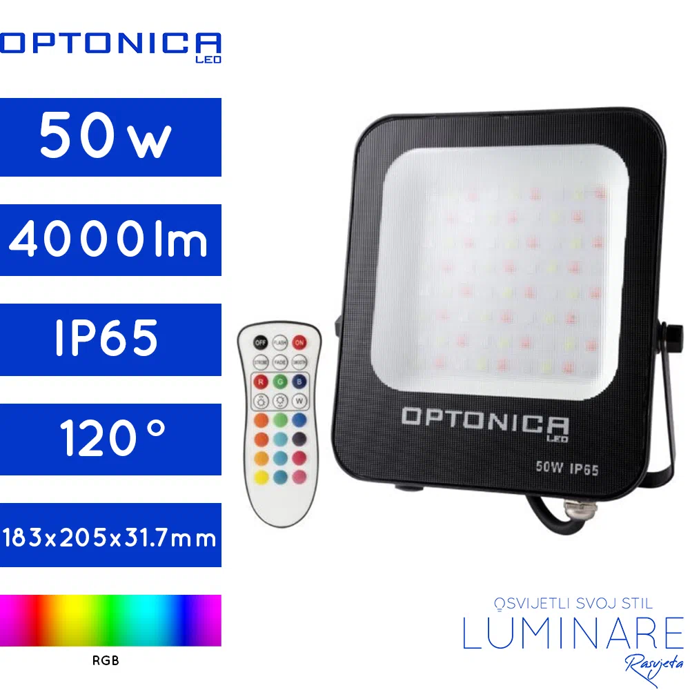 LED RGB reflektor snage 50W dolazi s daljinskim upravljačem, a služi za dekorativnu svjetlost.