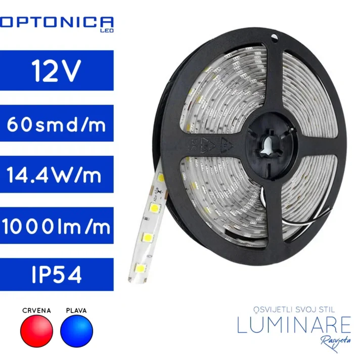 LED TRAKA 5050 12V 14.4W/m 1000lm/m 60LED/m IP54 – 5 metara CRVENA / PLAVA – 4842 / 4843