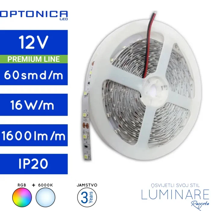 Sa snagom od 16W po metru, ova LED traka pruža intenzivan svjetlosni učinak, što ju čini pogodnom i za dekorativne i za funkcionalne primjene. Zahvaljujući 5050 LED čipovima i 60 LED dioda po metru, boje su zasićene i izražene, dok bijelo svjetlo daje dobru vidljivost.