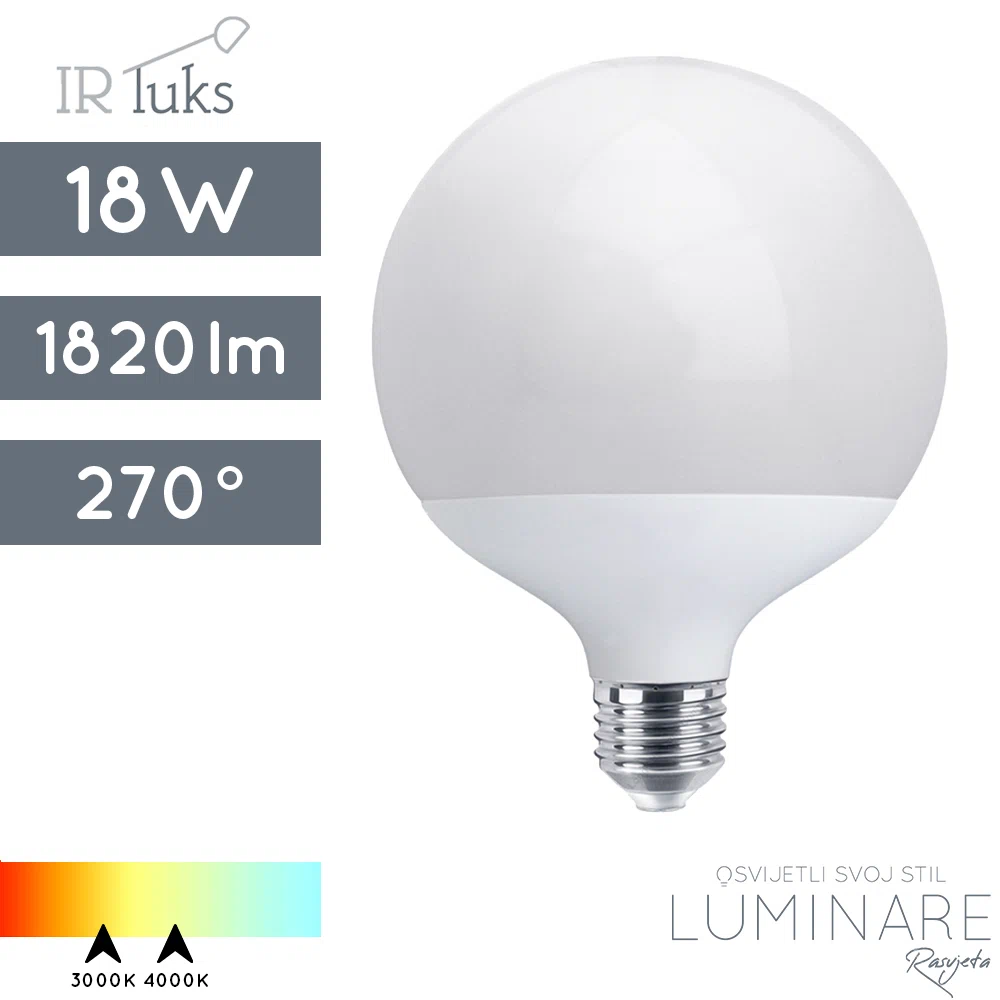 LED E27 G120 žarulja snage 18W je snažan i moderan izvor svjetla dizajniran za prostore u kojima je potrebna visoka razina osvjetljenja i široka pokrivenost. Kao velika G120 žarulja s promjerom od 120 mm i visinom od 160 mm, već na prvi pogled djeluje impresivno te je idealna za dekorativne svjetiljke u kojima sama žarulja dolazi do izražaja. Zahvaljujući svom formatu, iznimno dobro funkcionira u većim prostorijama, otvorenim konceptima, ugostiteljskim objektima, uredima i modernim interijerima.