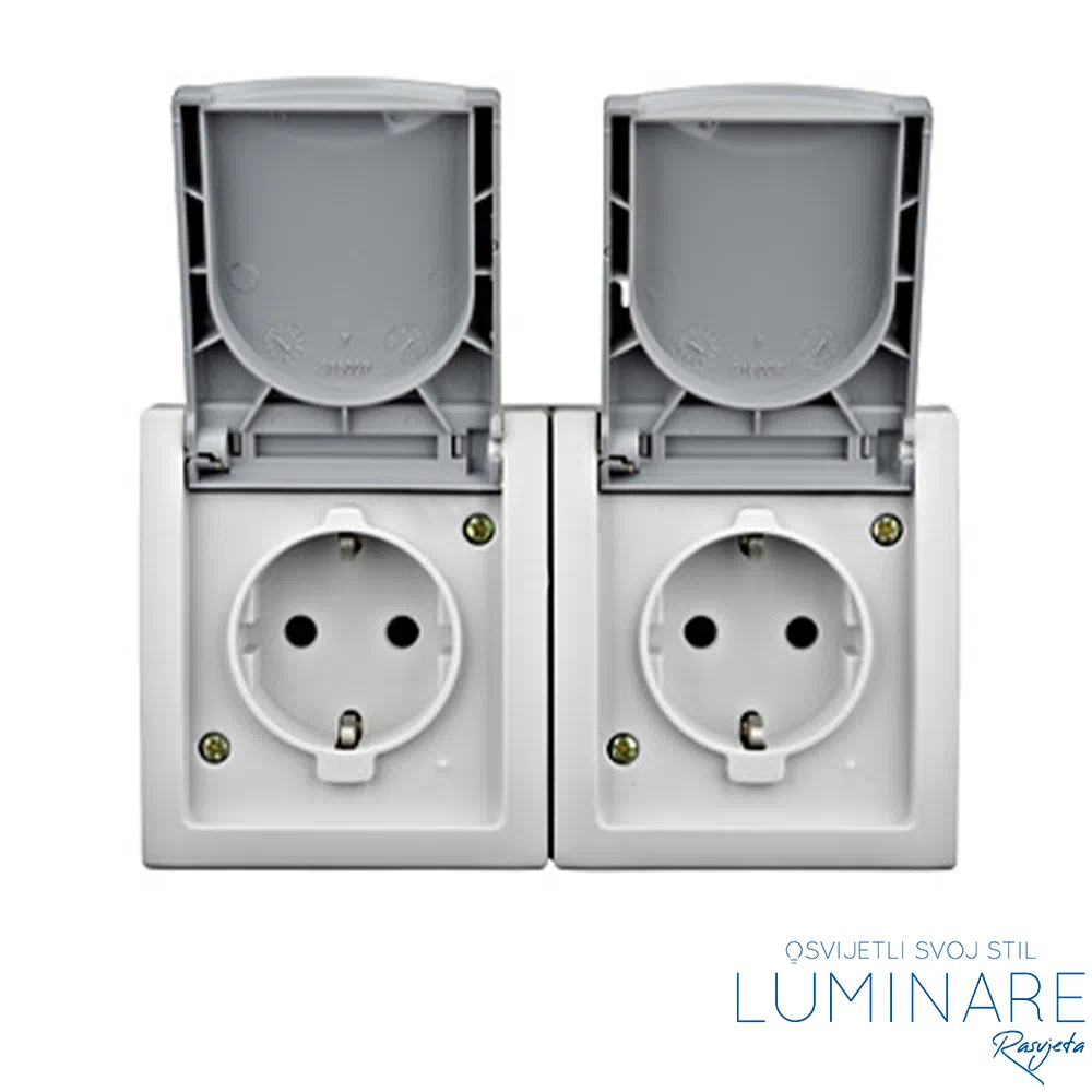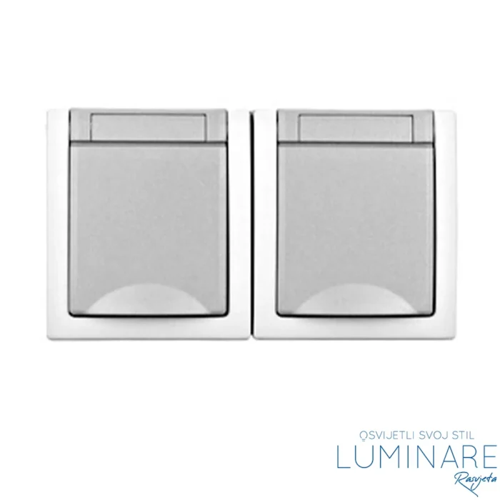 Dvostruka horizontalna utičnica sa poklopcem u sivoj boji je praktično rješenje za spajanje električnih uređaja na otvorenom prostoru.