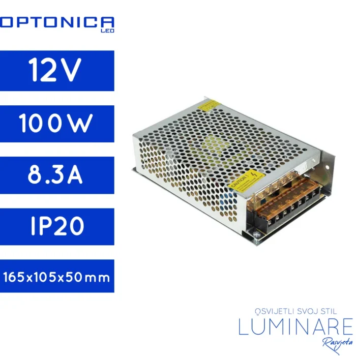 Optonica napajanje za LED trake 12V 100W iz Standard serije savršen je izbor za sve koji trebaju snažno, stabilno i dugotrajno rješenje za napajanje LED rasvjete. Sa snagom od 100W i izlaznim naponom od 12V DC, ovaj model pruža dovoljno kapaciteta za srednje i veće instalacije LED traka, bilo u stambenim prostorima ili u zahtjevnijim komercijalnim projektima.