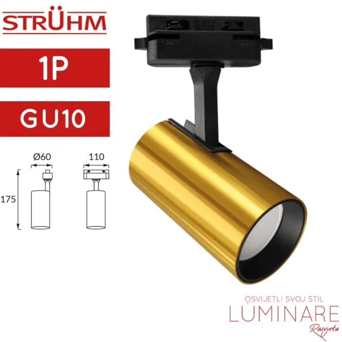Kučište zlatne boje za GU10 žarulju koje ima spojnicu za postavljanje u monofaznu šinu. Idealno jer ostavlja mogućnost izbora GU10 žarulje po želji kao i laku zamjenu istih.