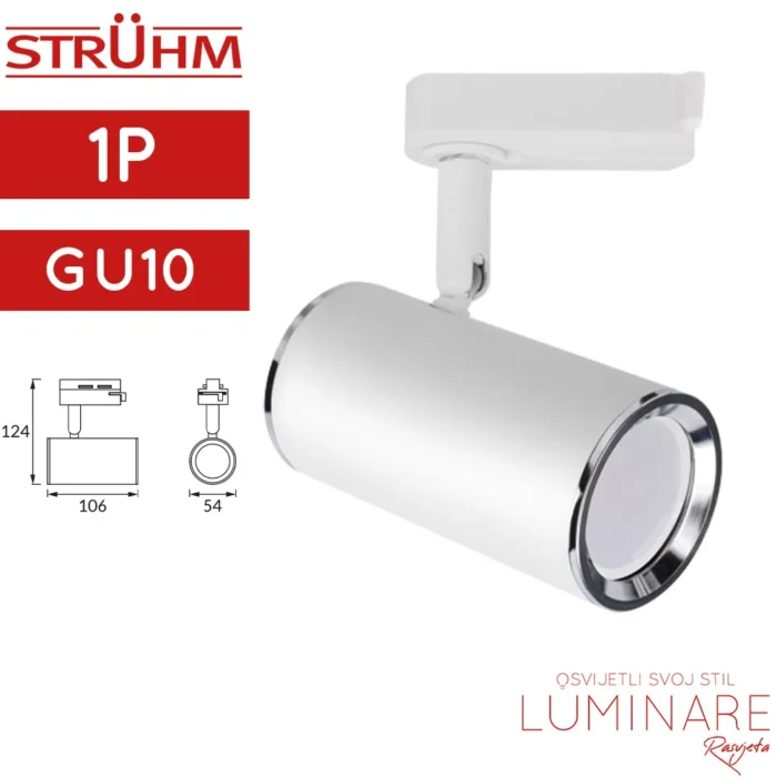 • Kučište bijele boje za GU10 žarulju koje ima spojnicu za postavljanje u monofaznu tračnu šinu.