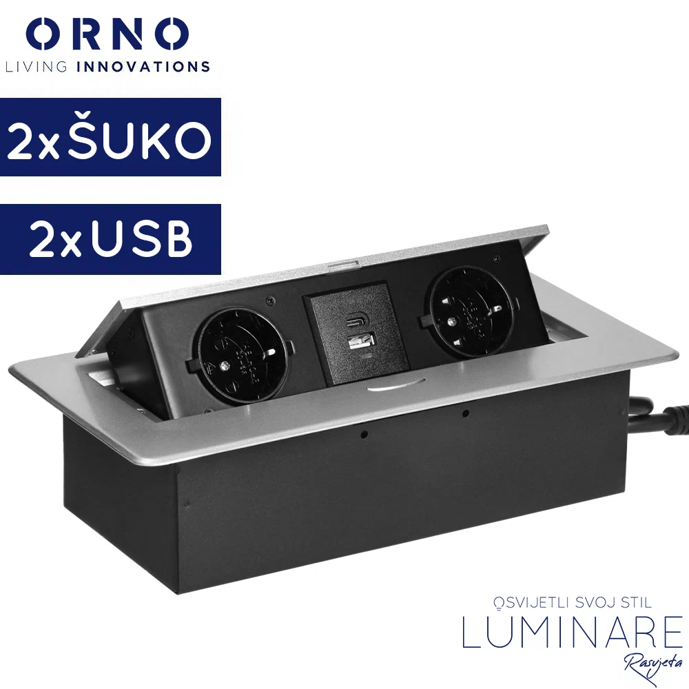 Ugradbena utičnica za namještaj 2x Schuko 2x USB s kabelom 1,5 m – srebrna Orno OR‑GM‑9035(GS)/G