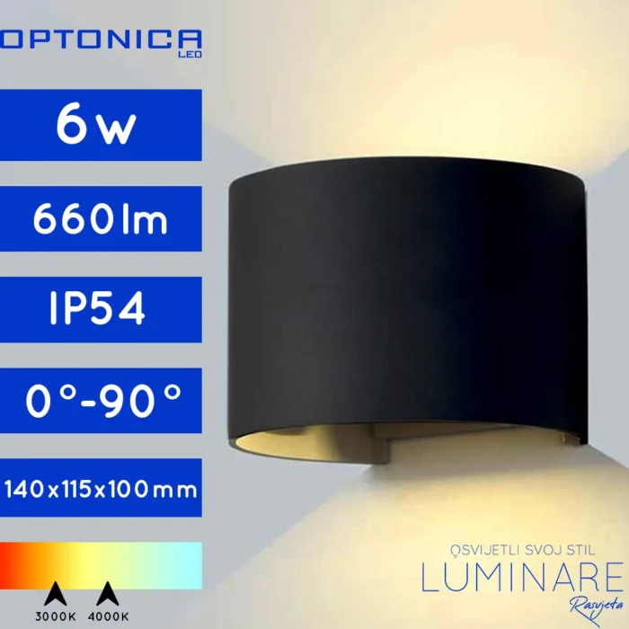 Zidna svjetiljka snage 6W, sa integriranim LED čipom. Svjetiljka svjetli gore i dolje, a kut osvjetljenja moguće je suziti od 0-90°.