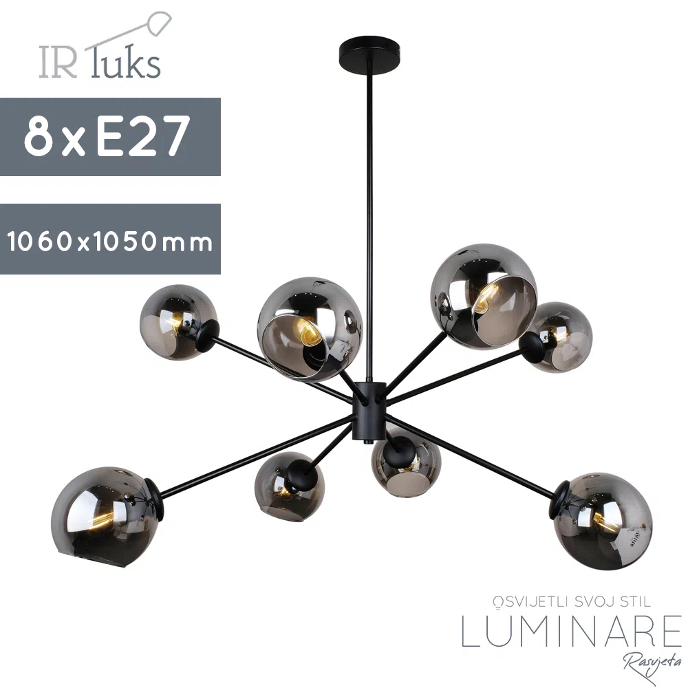 Svaka od osam šipki nosi E27 grlo za žarulje, pružajući vam mogućnost da prilagodite osvjetljenje prema svojim potrebama. Oko svake žarulje nalazi se tamno prozirna kugla, stvarajući efekt suptilnog i ugodnog svjetla, istovremeno dodajući sofisticirani šarm.